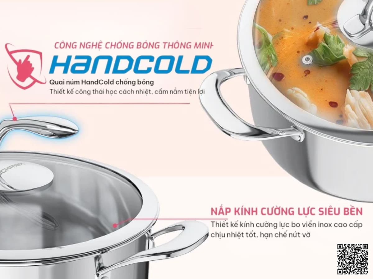 - Quai núm HandCold chống bỏng thế hệ mới: Được thiết kế theo nguyên lý công thái học, quai và núm nồi cách nhiệt vượt trội, giúp cầm nắm dễ dàng, chắc tay và an toàn tuyệt đối.