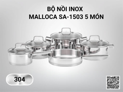Bộ nồi inox Malloca SA-1503 5 món bao gồm 1 quánh Ø16cm, 3 nồi Ø18/20/24cm và 1 chảo Ø24cm, đáp ứng đầy đủ nhu cầu nấu nướng hàng ngày của gia đình. Bộ nồi được làm từ chất liệu inox 304 an toàn, chống hoen gỉ, dễ vệ sinh. Cấu tạo đáy 3 lớp siêu bền, hiệu suất đun nấu cao và có thể dùng được trên mọi loại bếp: bếp từ, bếp gas, hồng ngoại…