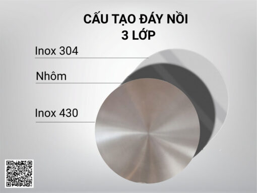 – Đáy nồi cấu tạo 3 lớp: lớp inox 304 bên trong cùng, lớp nhôm ở giữa và lớp inox 430 bên ngoài. Hiệu suất dẫn nhiệt tốt, phân bổ nhiệt đều và giữ nhiệt lâu.