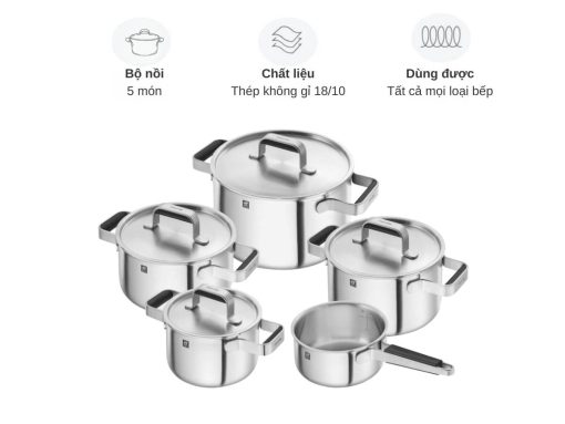 [caption id="attachment_119987" align="alignnone" width="1200"] Dùng được trên mọi loại bếp, kể cả bếp từ và lò nướng, tiện lợi cho mọi không gian bếp[/caption]Nhờ thiết kế đáy nồi từ tính, bộ nồi inox Zwilling Pure 5 món tương thích với mọi loại bếp, bao gồm bếp gas, bếp điện, bếp hồng ngoại và đặc biệt là bếp từ. Bạn có thể yên tâm sử dụng linh hoạt trong mọi không gian bếp, mang lại trải nghiệm nấu nướng tiện lợi và chuyên nghiệp.