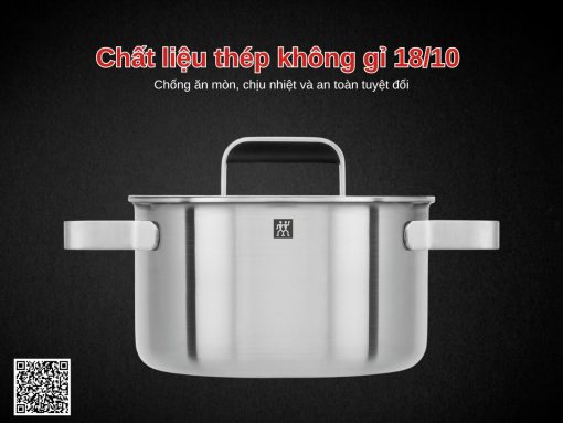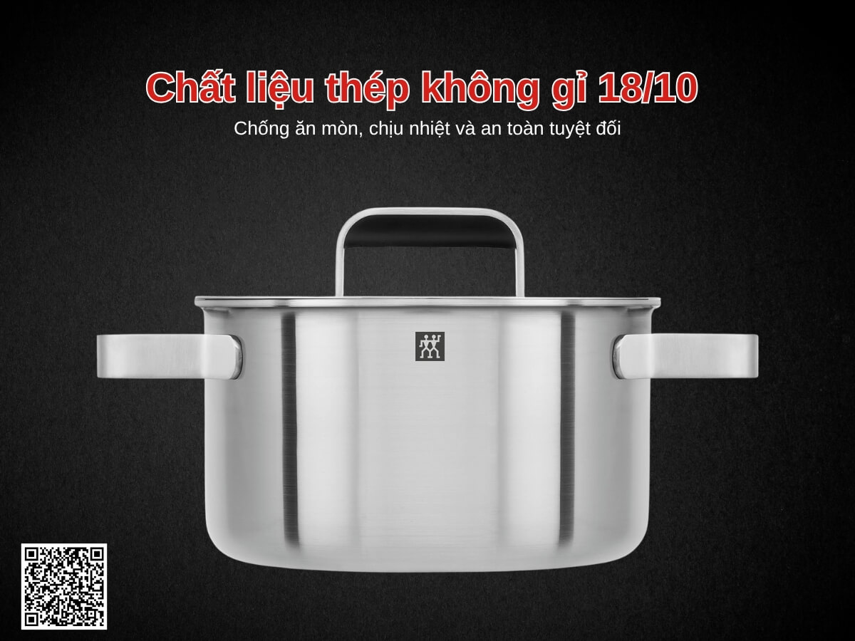 [caption id="attachment_119980" align="alignnone" width="1200"] Chất liệu inox 18/10 cao cấp, sáng bóng, bền bỉ và chống ăn mòn, an toàn tuyệt đối khi sử dụng[/caption]Toàn bộ nồi trong bộ nồi inox Zwilling Pure 5 món được chế tác từ thép không gỉ 18/10 cao cấp, nổi bật với khả năng chống ăn mòn, chịu nhiệt và bền bỉ theo thời gian. Lớp inox không phản ứng với thực phẩm, đảm bảo an toàn tuyệt đối cho sức khỏe người dùng. Một số phiên bản còn được phủ lớp gốm màu sang trọng, mang đến vẻ ngoài tinh tế, hiện đại cho không gian bếp.