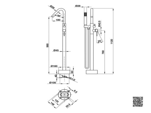 - Chiều cao tổng thể của bộ trộn đạt 1120mm, phù hợp cho các bồn tắm đặt sàn, tạo sự cân đối và hài hòa cho phòng tắm.