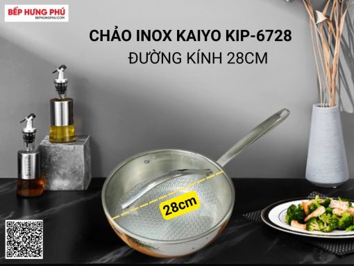 Chảo inox 3 lớp liền thân dập nổi Kaiyo KIP-6728 có đường kính 28cm, cao 6cm. Chảo được làm từ chất liệu inox 304 cao cấp, chống gỉ sét, bền bỉ và dễ vệ sinh. Đặc biệt là cấu tạo đáy 3 lớp liền thân (dày 2.5mm) bắt nhiệt tốt và toả nhiệt đều, giúp nấu ăn ngon hơn, đặc biệt có thể sử dụng được trên mọi loại bếp: bếp gas, bếp từ, bếp hồng ngoại.