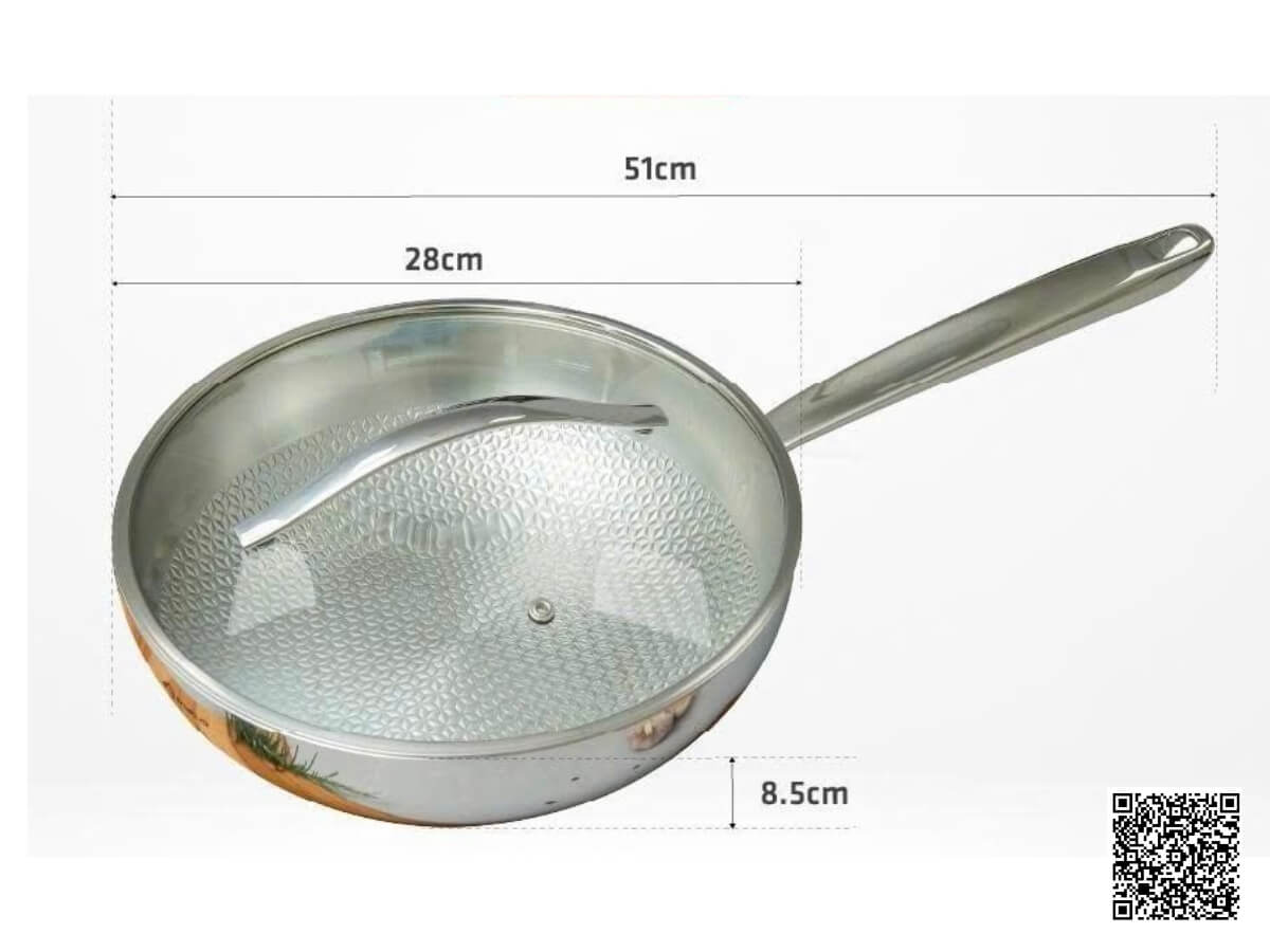 - Chảo có đường kính 28cm, cao 6cm, lòng chảo cạn phù hợp để chế biến các món chiên rán, áp chảo, làm bánh, trứng ốp la…