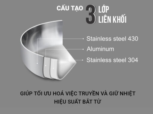 – Lớp ngoài cùng tiếp xúc với bếp nấu là inox 430 cho hiệu suất bắt từ cao, giúp tiết kiệm nhiên liệu tối đa khi nấu.