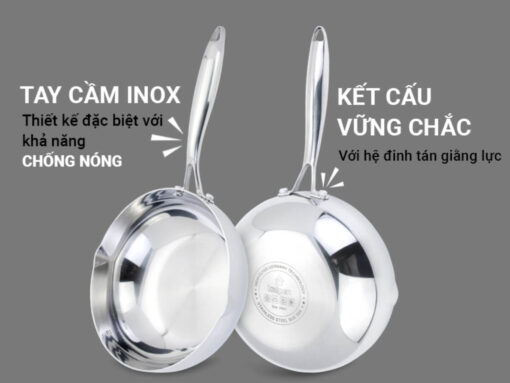 Ưu điểm vượt trội của tay cầm inox là độ bền vĩnh cửu, không bị cong vênh, ẩm mốc hay cháy xém khi gặp nhiệt độ cao như tay cầm gỗ. Đặc biệt, thiết kế kim loại nguyên khối này cho phép bạn sử dụng chảo một cách an toàn trong lò nướng, mở rộng khả năng chế biến nhiều món ăn hơn.