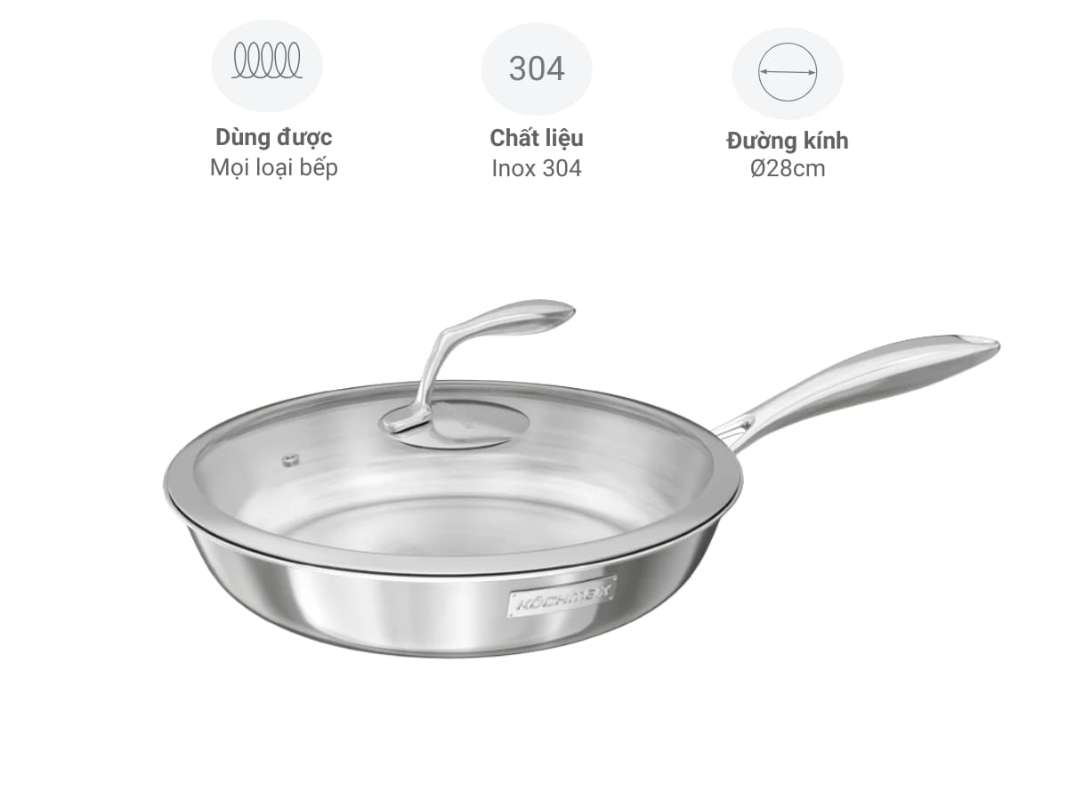 Chảo inox 3 lớp liền thân Kochmax KMP-28C size 28cm lý tưởng cho mọi căn bếp hiện đại, kết hợp giữa độ bền vượt trội, khả năng truyền nhiệt tối ưu và thiết kế tinh tế. Chảo được làm từ chất liệu inox 304 cao cấp chuẩn LFGB của Đức, không han gỉ, chống oxy hóa cao và an toàn tuyệt đối. Đặc biệt là cấu tạo 3 lớp nguyên khối giúp bắt nhiệt siêu nhạy và toả nhiệt đều, giúp nấu ăn nhanh hơn, ngon hơn và tiết kiệm năng lượng, đặc biệt có thể sử dụng được trên mọi loại bếp: bếp gas, bếp từ, bếp hồng ngoại.