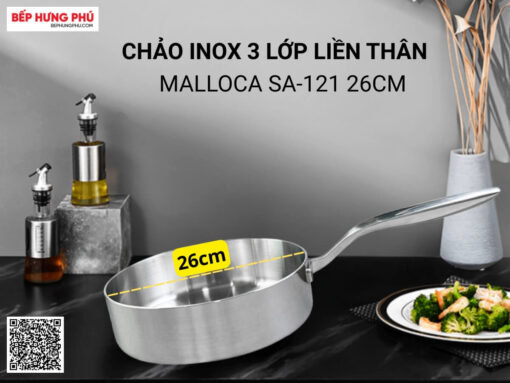 Chảo inox 3 lớp liền thân Malloca SA-121 đường kính 26cm, phù hợp với nhiều món chiên xào. Chảo được làm từ chất liệu inox 304 cao cấp, cơ chế chống dính tự nhiên an toàn, chống gỉ sét, bền bỉ và dễ vệ sinh. Đặc biệt là cấu tạo đáy 3 lớp liền thân bắt nhiệt tốt và toả nhiệt đều, giúp nấu ăn ngon hơn, đặc biệt có thể sử dụng được trên mọi loại bếp: bếp gas, bếp từ, bếp hồng ngoại.