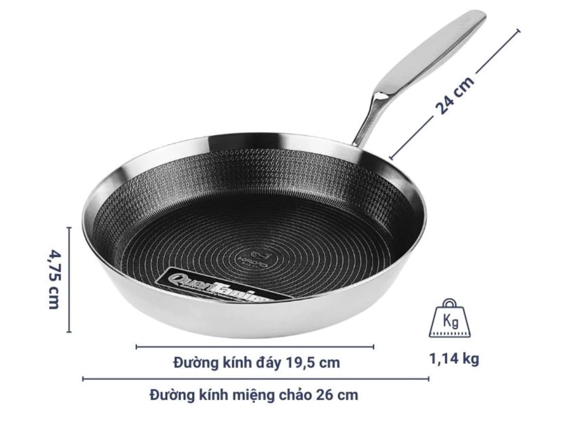 Chảo inox 3 lớp liền thân Tri-Ply Kaiyo KNF26 có đường kính 26cm, cao 4,75 cm. Chảo được làm từ chất liệu inox 18/10 cao cấp, bền bỉ và dễ vệ sinh. Đặc biệt là cấu tạo đáy 3 lớp liền thân bắt nhiệt tốt và toả nhiệt đều, giúp nấu ăn ngon hơn. Chảo có thể sử dụng được trên mọi loại bếp: bếp gas, bếp từ, bếp hồng ngoại.