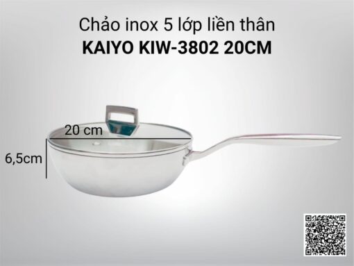 Chảo inox 5 lớp liền thân Kaiyo KIW-3802 đường kính 20cm, cao 6,5cm, phù hợp với nhiều món chiên xào. Chảo được làm từ chất liệu inox 316 cao cấp, chống gỉ sét, an toàn và dễ vệ sinh. Đặc biệt là cấu tạo đáy 5 lớp liền thân bắt nhiệt tốt và toả nhiệt đều, giúp nấu ăn ngon hơn, đặc biệt có thể sử dụng được trên mọi loại bếp: bếp gas, bếp từ, bếp hồng ngoại. Chảo còn có nắp đậy thuỷ tinh đi kèm tăng thêm tiện lợi cho quá trình nấu nướng.