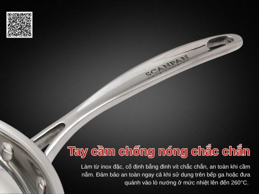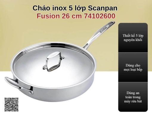 được làm từ inox 18/10 cao cấp với đáy đúc liền 5 lớp, giúp truyền nhiệt nhanh, đều và tiết kiệm năng lượng. Sản phẩm dùng được trên mọi loại bếp, chịu nhiệt tốt, tay cầm cách nhiệt an toàn, dễ thao tác. Kiểu dáng sang trọng, dễ vệ sinh, là lựa chọn lý tưởng cho mọi bếp ăn hiện đại. Tổng quan về chảo inox 5 lớp liền thân Scanpan Fusion 24cm 74002400 [caption id="attachment_121900" align="alignnone" width="1200"] Chất liệu inox 18/10 đáy đúc liền 5 lớp giúp truyền nhiệt nhanh, đồng đều và tối ưu năng lượng[/caption]Chảo inox 5 lớp liền thân Scanpan Fusion 24cm 74002400 được làm từ inox 18/10 cao cấp, đảm bảo độ bền, chống ăn mòn và an toàn cho sức khỏe. Cấu tạo 5 lớp liền thân và đáy giúp truyền nhiệt nhanh, phân bổ nhiệt đều, dễ kiểm soát nhiệt độ trong quá trình nấu nướng và tiết kiệm năng lượng. Nhờ kỹ thuật đúc áp lực đặc biệt, chảo không bị cong hay vênh và hoàn toàn loại bỏ các điểm nóng, giúp thức ăn chín đều, giữ nhiệt tốt hơn các loại chảo inox thông thường. Sử dụng được trên mọi loại bếp [caption id="attachment_121897" align="alignnone" width="1200"] Tay cầm bằng inox đặc, gắn chắc chắn bằng đinh vít, chống nóng tốt, an toàn khi sử dụng[/caption]Scanpan Fusion 24cm 74002400 với tay cầm chảo được làm bằng inox đặc, cố định bằng đinh vít chắc chắn, giúp chống nóng hiệu quả khi nấu trên bếp ga hoặc trong lò nướng ở nhiệt độ lên đến 260°C. Thiết kế tay cầm đảm bảo an toàn và thuận tiện khi thao tác, đồng thời giữ chảo vững chắc ngay cả khi di chuyển với thực phẩm nặng. Dễ dàng vệ sinh Chảo inox 5 lớp liền thân Scanpan Fusion 24cm 74002400 rất dễ dàng vệ sinh sau khi sử dụng và hoàn toàn an toàn cho máy rửa bát. Bề mặt inox bóng bẩy giúp loại bỏ thức ăn bám dính nhanh chóng, đồng thời đảm bảo vệ sinh và an toàn cho sức khỏe. Hình ảnh thực tế [caption id="attachment_121899" align="alignnone" width="1200"] Chất liệu inox 18/10 cao cấp, bền, sáng bóng và an toàn sức khỏe[/caption][caption id="attachment_121896" align="alignnone" width="1200"] Showroom Bếp Hưng Phú[/caption]Ngoài ra quý khách hàng có thể tham khảo thêm các sản phẩm