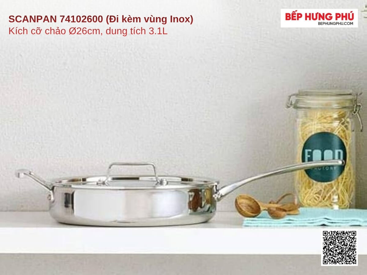 được nhập khẩu nguyên chiếc từ Đan Mạch với đáy 3 lớp truyền nhiệt đều, chất liệu inox 18/10 cao cấp, tay cầm chống nóng và sử dụng được trên mọi loại bếp. Chảo có bề ngoài inox mờ sang trọng, dễ dàng vệ sinh và phù hợp cho chiên, xào, rán mọi món ăn. Tổng quan về chảo inox 3 lớp liền thân Scanpan Impact 32cm 71113200 [caption id="attachment_122623" align="alignnone" width="1200"] Chảo Scanpan Impact 32 cm với đáy 3 lớp giúp truyền nhiệt nhanh và đều[/caption]Chảo inox 3 lớp liền thân Scanpan Impact 32cm được chế tạo từ inox 18/10 cao cấp, kết hợp đáy 3 lớp liền thân, đảm bảo truyền nhiệt nhanh và đều khắp bề mặt. Thiết kế liền thân giúp chảo không bị cong, vênh, bề mặt nóng đều, duy trì nhiệt tốt hơn các loại chảo thông thường, giúp bạn kiểm soát nhiệt độ chính xác khi nấu nướng. Sử dụng được trên mọi loại bếp Chảo inox 3 lớp liền thân Scanpan Impact 32cm có thể sử dụng trên mọi loại bếp: bếp ga, bếp điện, bếp hồng ngoại và bếp từ. Khả năng chịu nhiệt tốt giúp bạn chiên, xào, rán, nướng dễ dàng mà không lo biến dạng hay ảnh hưởng đến chất lượng chảo. Nhờ đó, sản phẩm trở thành dụng cụ nấu ăn linh hoạt, đáp ứng nhu cầu đa dạng của gia đình hiện đại. Nắp kính chịu nhiệt và tay cầm cách nhiệt tốt [caption id="attachment_122624" align="alignnone" width="1200"] Showroom Bếp Hưng Phú[/caption]Ngoài ra quý khách hàng có thể tham khảo thêm các sản phẩm