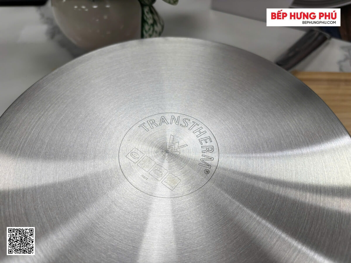 Và Chảo WMF Profi-Pfannen 28cm được trang bị đáy chảo TransTherm có cấu tạo gồm 3 lớp với 1 lớp nhôm nguyên chất dày được ép chặt ở giữa 2 lớp vật liệu Cromargan. Lớp nhôm nguyên chất có khả năng hấp thu nhiệt cực nhanh và phân bố nhiệt đều ra khắp bề mặt đáy và cả thành chảo. Món ăn sẽ được gia nhiệt đều từ dưới lên trên và quanh thành chảo, giúp chín đều ở mọi vị trí.