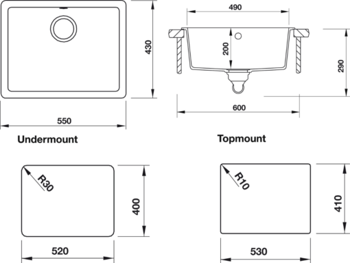 - Kích thước cắt đá lắp nổi: 530D x 410R mm
