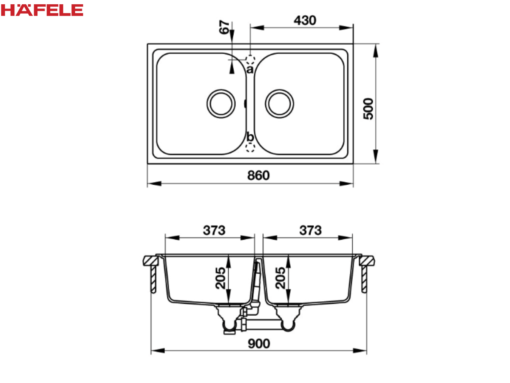 Chậu đá Häfele HS19-GEN2R90 (570.35.580) có kích thước chậu là 860D x 500R mm. Trong đó, 2 hố chậu có kích thước như nhau là 373D x 421R mm, đáp ứng tốt nhu sử dụng hàng ngày cho gia đình có ít thành viên. Độ sâu bồn 205mm giúp hạn chế bắn nước ra ngoài trong quá trình sử dụng.
