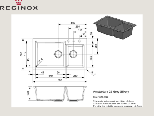 Chậu đá Reginox Amsterdam 25 R31094 có kích thước chậu (DxRxS) là 860 x 500 x 220 mm, với hai hố chậu có kích thước (DxRxS) lần lượt là 470 x 410 x 220 mm và 280 x 355 x 220 mm. Điều này đảm bảo rằng chậu đá này đáp ứng tốt nhu cầu sử dụng hàng ngày cho gia đình của bạn. Với độ sâu bồn 220 mm, bạn có đủ không gian để sử dụng thoải mái mà không cần lo lắng về việc bắn nước ra ngoài trong quá trình rửa dọn.