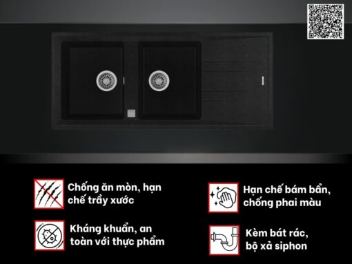 Chậu đá Teka Stone 80 B-TG 2B 1D BLACK 115400011 thuộc dòng chậu đôi lắp nổi với 2 hộc rửa và 1 bàn chậu, kích thước 1160D x 510R mm, lòng chậu sâu 200mm giúp phân chia công việc rửa và sơ chế thực phẩm một cách tiện lợi, không lo văng nước. Với tông màu đen sang trọng và hiện đại, chậu được làm từ chất liệu đá thạch anh Tegranite+ cao cấp, có khả năng chịu va đập, chịu sốc nhiệt cực tốt, đảm bảo an toàn sức khoẻ và độ bền dài lâu. Đặc biệt, chậu có bề mặt kháng khuẩn, chống tia UV không phai màu và đi kèm bộ xả rổ lọc 3½” tiện dụng.