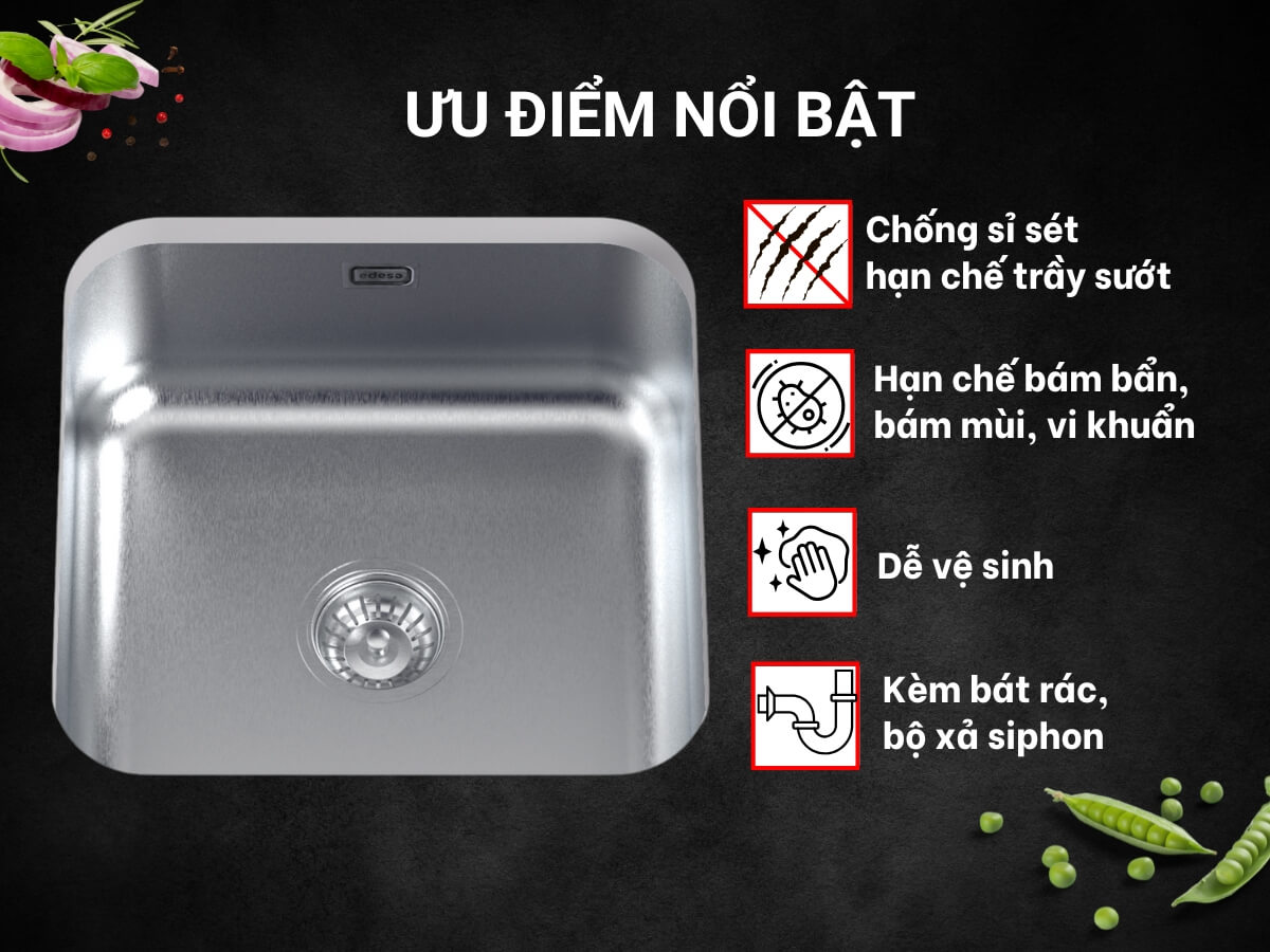Bát rác với đường kính lớn, tăng hiệu quả thoát nước. Chất liệu inox đảm bảo chất lượng và độ bền. Bên cạnh đó là bộ xả siphon thông minh với thiết kế cải tiến, giúp tăng cường hiệu quả dẫn thoát nước thải, chống tắc nghẽn và ngăn hình thành mùi hôi khó chịu.