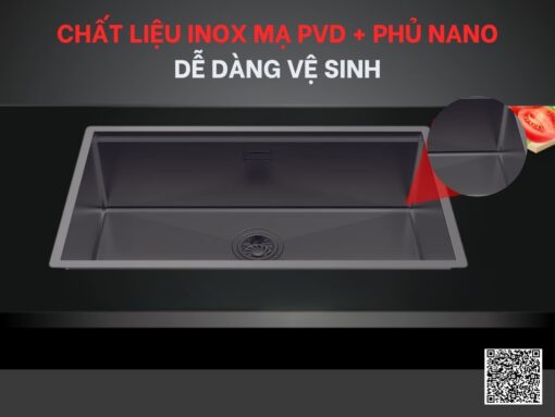 Chậu inox Hafele HS25-SSN1S-7644 (567.24.486) được làm từ vật liệu inox cùng công nghệ mạ PVD tiên tiến, cung cấp khả năng chống ăn mòn, giúp sản phẩm bền đẹp, an toàn, có thể chịu được tác động từ môi trường nhà bếp mà không lo bị gỉ sét hay mài mòn ảnh hưởng đến tính thẩm mỹ và chất lượng của chậu. Bên cạnh đó là lớp phủ Nano trên cùng giúp cho bề mặt chậu nhẵn bóng, thoát nước nhanh chóng và dễ dàng vệ sinh.