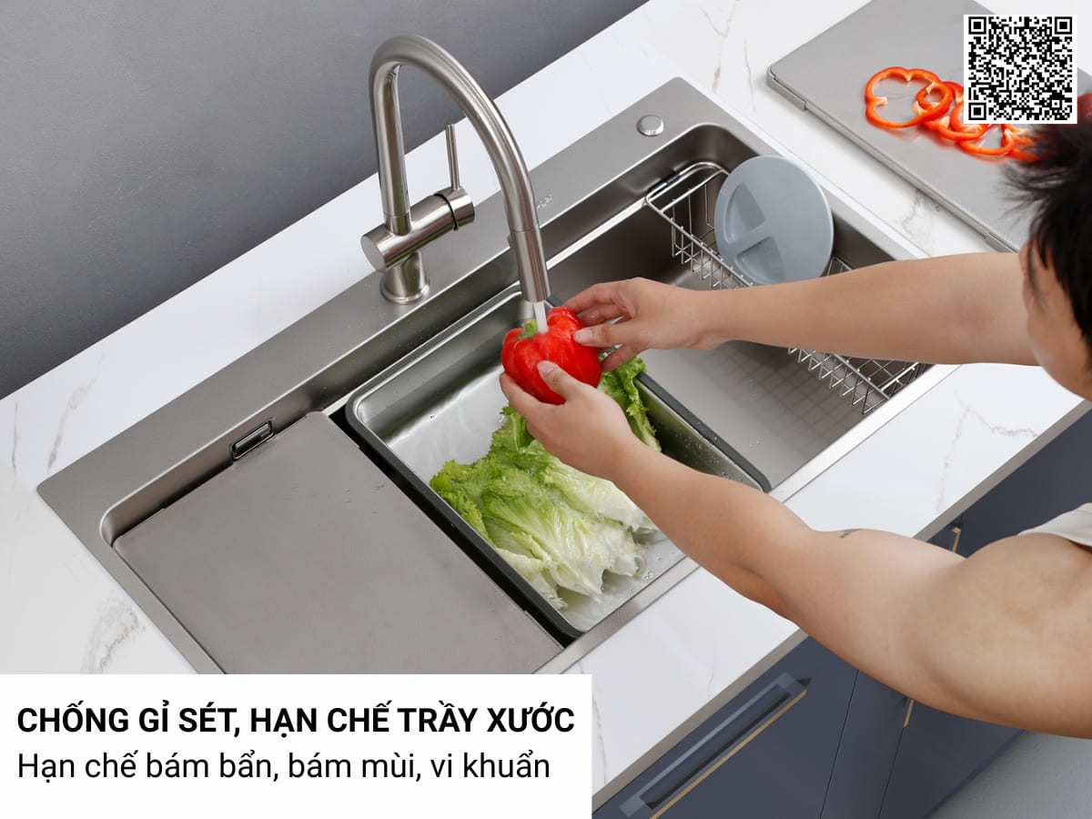 Chậu inox Kluger KF8850FS Plus được làm từ inox 304 cao cấp, chống gỉ, bề mặt nhẵn mịn và ít bị bám bẩn nên việc vệ sinh, lau chùi chậu cũng rất dễ dàng. Sau mỗi lần sử dụng, chỉ cần làm sạch bề mặt chậu rửa bằng vải mềm và ẩm. Nếu chậu rửa dính nhiều dầu mỡ và cặn bẩn, hãy thêm một ít chất tẩy rửa và rửa sạch lại bằng nước.
