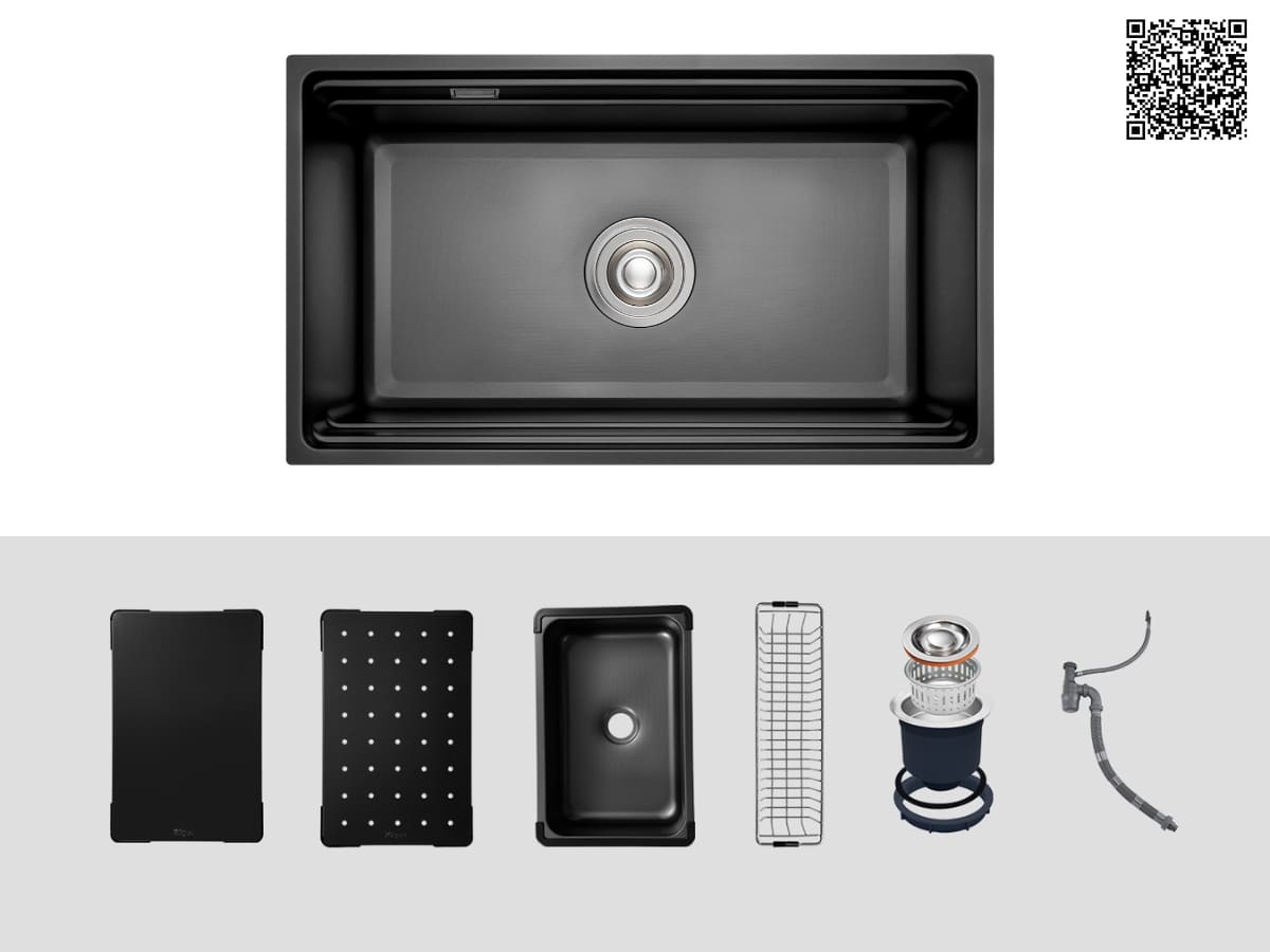 Chậu Inox Kluger KWU8161FB – S76 Plus thuộc dòng chậu đơn K600 Series với kích thước 760D x 445R mm, lòng chậu sâu 220mm giúp thoải mái rửa đồ mà không sợ bị văng nước. Chậu được làm từ chất liệu thép không gỉ POSCO 304 cao cấp, với bề mặt LINEN dập nổi màu đen sang trọng, có khả năng chống hoen gỉ, chống ăn mòn, an toàn sức khoẻ và độ bền dài lâu.
