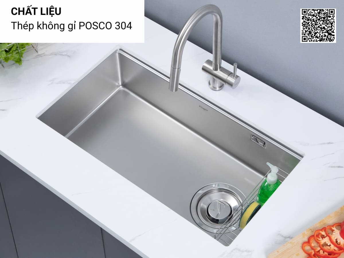 Chậu được làm từ vật liệu POSCO 304 có đặc tính chống gỉ sét, chống ăn mòn tối ưu. Bề mặt SUPER LINEN thế hệ mới giúp hạn chế tối đa trầy xước, bảo vệ bề mặt chậu luôn sáng đẹp bền lâu.