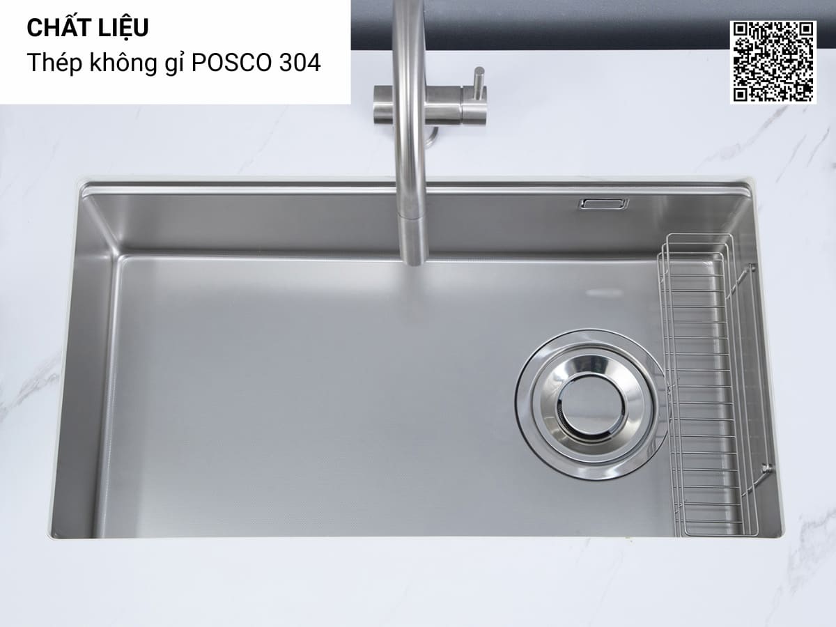 Chậu được làm từ vật liệu POSCO 304 có đặc tính chống gỉ sét, chống ăn mòn tối ưu. Bề mặt SUPER LINEN thế hệ mới giúp hạn chế tối đa trầy xước, bảo vệ bề mặt chậu luôn sáng đẹp bền lâu.
