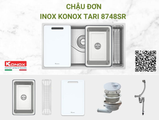 Chậu inox Konox TARI 8748SR còn đi kèm bát rác và bộ xả siphon chất lượng cao.