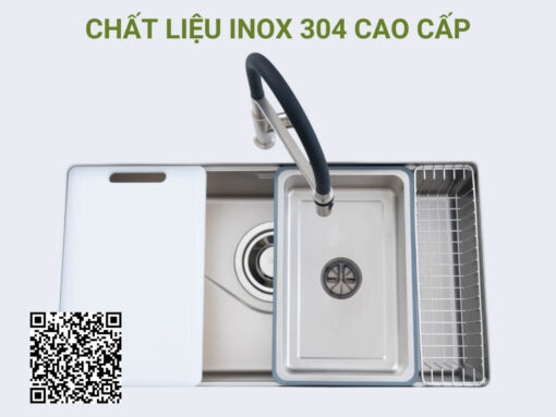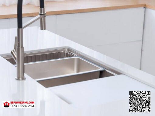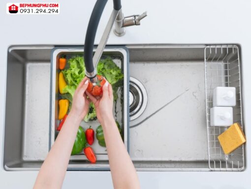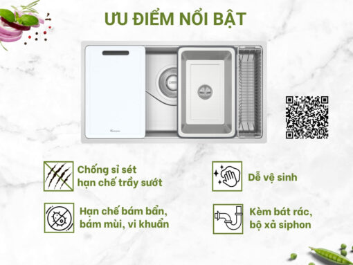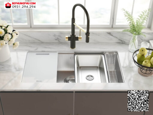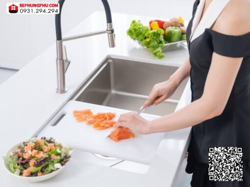 Đặc biệt, chậu được thiết kế gờ hạ bậc hiện đại, có thể tích hợp nhiều phụ kiện như chậu rửa nhỏ, thớt nhựa, rổ phụ để tăng thêm tiện lợi cho quá trình rửa dọn, có thể cắt thực phẩm và hong ráo ngay trên chậu mà không tốn thêm không gian trên bàn bếp.