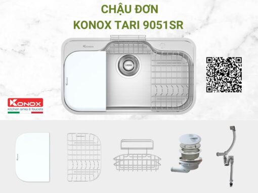 Chậu inox Konox TARI 9051SR còn đi kèm bát rác và bộ xả siphon chất lượng cao.