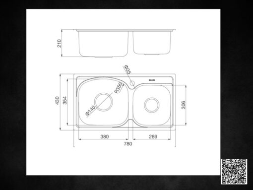 - Chậu trái: 380D x 354R mm – sâu 210 mm
