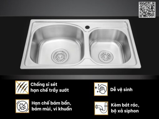 Với thiết kế chậu đôi, bạn có thể sử dụng đồng thời 2 chậu để rửa rau củ hoặc chén bát, xoong nồi cùng lúc, đảm bảo tiện lợi và thoải mái.