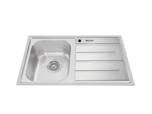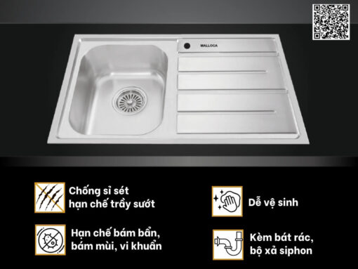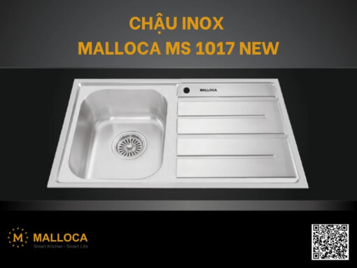 Chậu inox Malloca MS 1017 NEW thiết kế chậu đơn có bàn với kích thước chậu 800D x 500R mm và kích thước lòng chậu 330D x 410R mm, độ sâu 200 mm, thoải mái rửa chén, thực phẩm mà không sợ bắn nước ra ngoài.