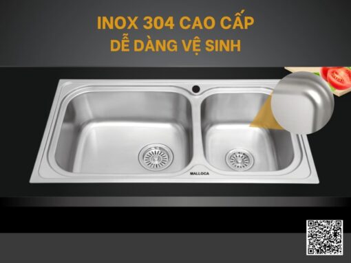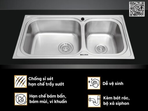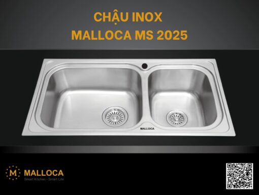 Chậu Inox Malloca MS 2025 thiết kế chậu 2 hố lệch, không bàn, kích thước 930D x 500R mm, sâu 220 mm và độ dày thành chậu 0.8 mm. Chất liệu inox 304 cao cấp với đặc tính chống gỉ sét, chống ăn mòn, độ bền cao. Sản phẩm đi kèm bát rác inox và bộ xả siphon ngăn mùi hiệu quả.
