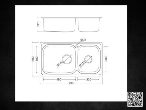 - Chậu trái: 480D x 400R mm – sâu 220 mm