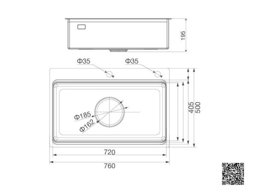 - Kích thước tổng thể: 760D x 500R x 195S mm