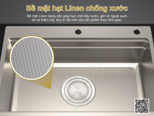 Một ưu điểm nổi bật của chậu inox Malloca MS 7650 Linen là bề mặt Linen dạng sần. Với kết cấu này, chậu hạn chế được các vết trầy xước do va chạm với xoong nồi, chén đĩa. Đồng thời, bề mặt sần cũng giúp giữ được vẻ ngoài sạch sẽ và thẩm mỹ, góp phần duy trì độ mới của sản phẩm theo thời gian.