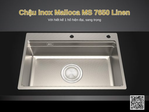 Chậu inox Malloca MS 7650 Linen thiết kế 1 hố hiện đại, sang trọng, làm từ thép không rỉ 304 cao cấp với bề mặt sần hạn chế trầy xước. Chậu đi kèm bộ xả thông minh ngăn mùi, lớp chống ồn và chống ngưng tụ nước, cùng các phụ kiện tiện lợi như rổ chén dĩa, rổ phụ và chậu nhỏ, giúp vệ sinh dễ dàng và sử dụng lâu bền.