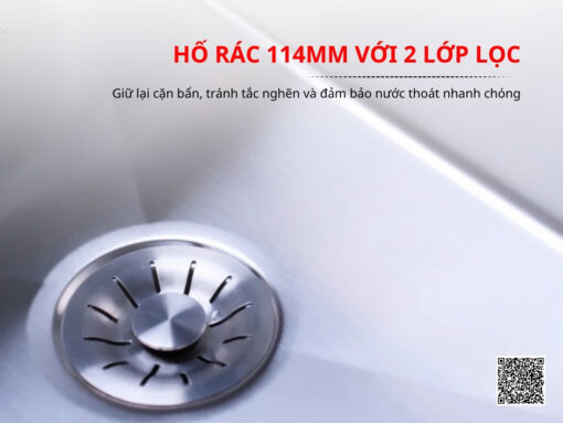 Hệ thống thoát nước 2 lớp lọc rác kích thước 114mm được thiết kế phù hợp với thói quen sử dụng của người Việt, giúp giữ lại cặn bẩn, tránh tắc nghẽn và đảm bảo nước thoát nhanh chóng. Bên cạnh đó, lớp FOAM chống thấm ngược ở mặt sau chậu kết hợp tấm cao su tiêu âm dày 3mm giúp giảm tiếng ồn và ngăn hiện tượng ngưng tụ nước ở mặt sau chậu, mang lại trải nghiệm êm ái và bền bỉ trong quá trình sử dụng.