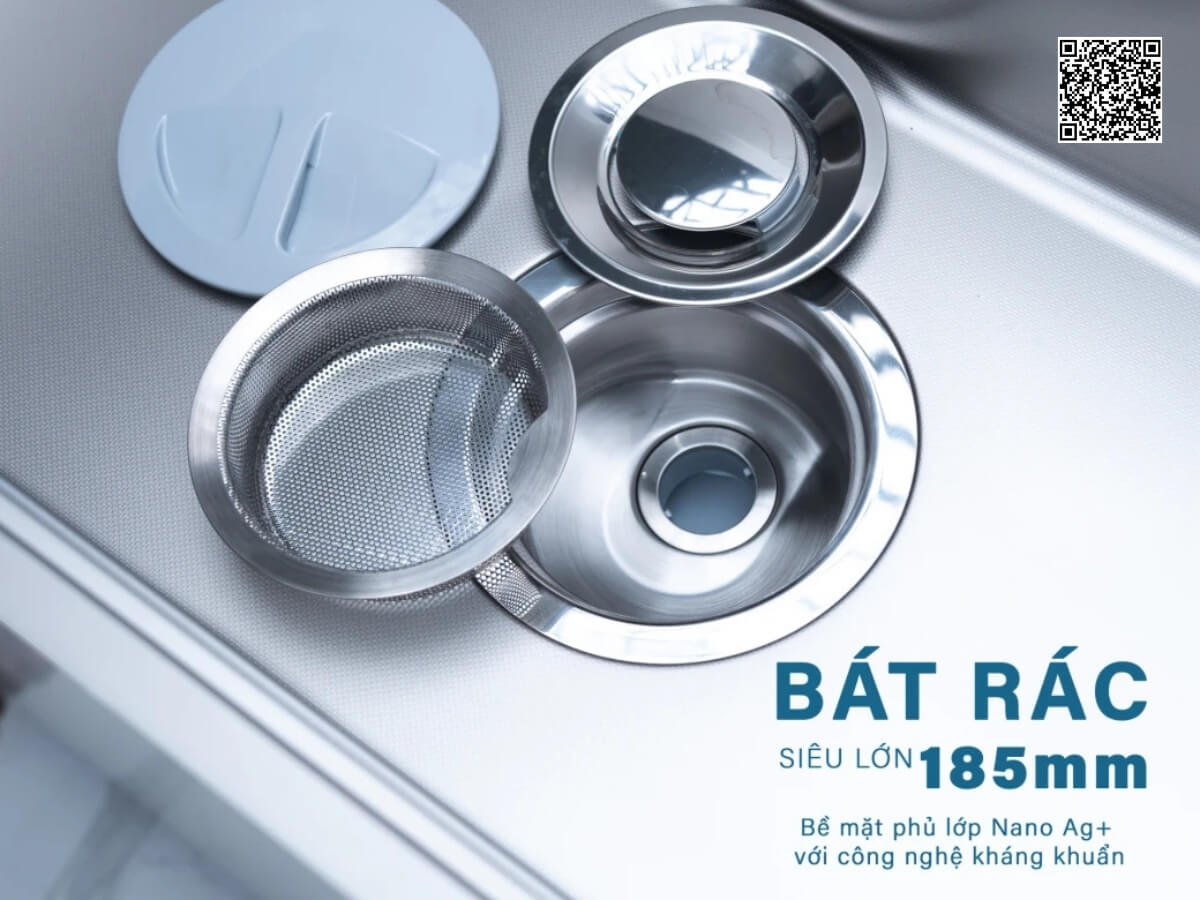Chậu inox Nobinox Lira NJ560D được trang bị bát rác kích thước lớn 185mm với 3 lớp lọc chống tắc thông minh, giúp thoát nước nhanh, hạn chế cặn bẩn và ngăn tình trạng ứ đọng. Hệ thống xiphong (ống thoát thải) cải tiến có cơ chế ngăn mùi hôi hiệu quả, đảm bảo khu vực bếp luôn khô thoáng, sạch sẽ và dễ chịu. Đây là một trong những điểm khác biệt giúp sản phẩm đáp ứng hoàn hảo thói quen sử dụng của người Việt trong sinh hoạt hằng ngày.