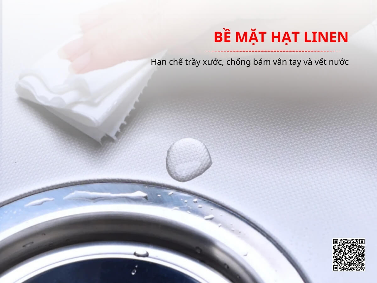Điểm nổi bật của chậu inox Nobinox Lira NJ560D nằm ở bề mặt Hạt Linen dập nổi độc quyền, giúp chống trầy xước, chống bám vân tay và hạn chế mài mòn tối đa. Lớp hoàn thiện này không chỉ giúp chậu luôn sáng bóng, dễ vệ sinh mà còn tạo hiệu ứng ánh kim tinh tế, tăng thêm nét sang trọng cho căn bếp. Bề mặt này đặc biệt phù hợp với các hộ gia đình thường xuyên nấu nướng, đảm bảo chậu luôn giữ được độ mới và sạch sẽ sau nhiều năm sử dụng.