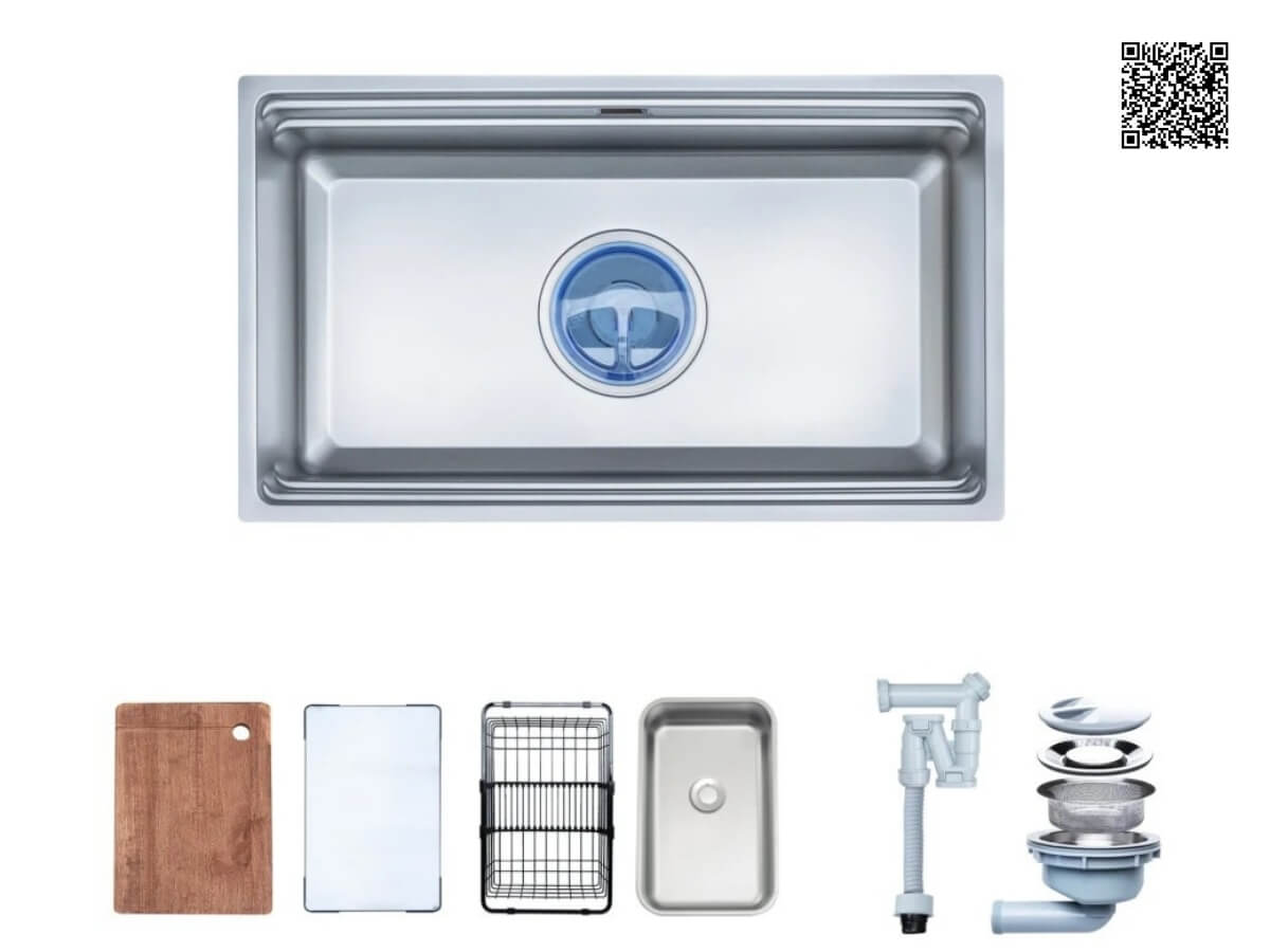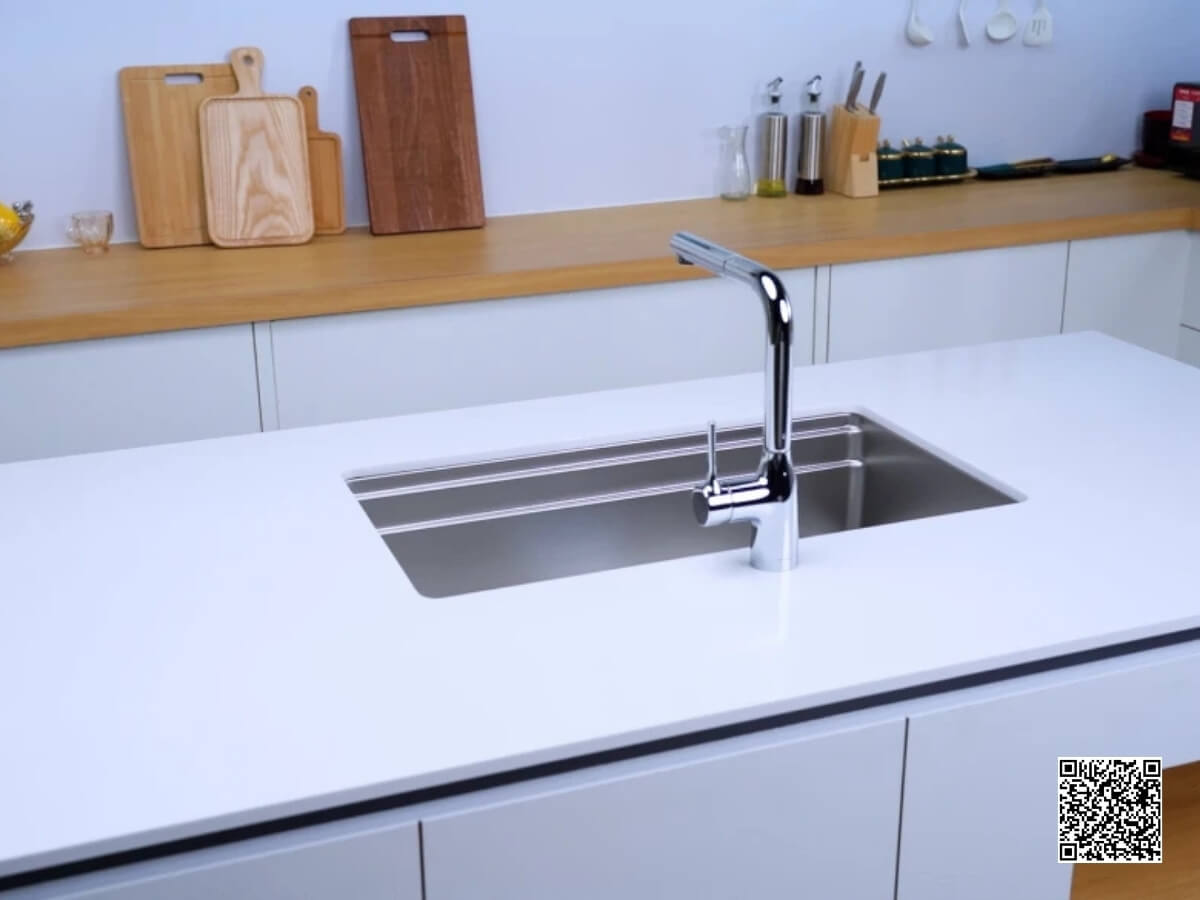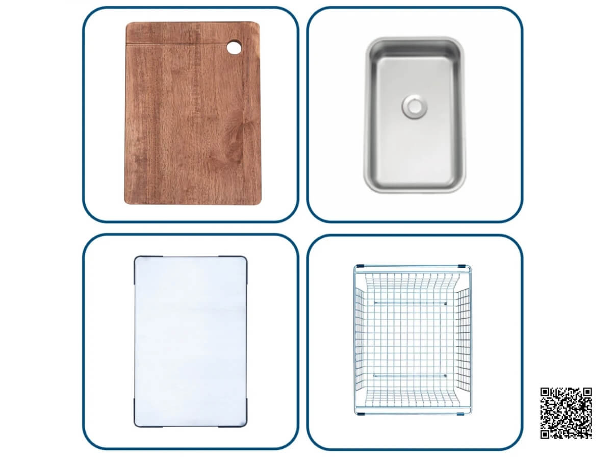Điểm đặc biệt nằm ở gờ hạ bậc thông minh, cho phép tích hợp linh hoạt các phụ kiện như rổ lọc, khay úp hay thớt trượt, mang đến sự tiện nghi và tối ưu không gian làm việc. Thiết kế này không chỉ nâng cao tính thẩm mỹ mà còn giúp việc chuẩn bị, sơ chế thực phẩm và vệ sinh trở nên dễ dàng, nhanh gọn hơn.
