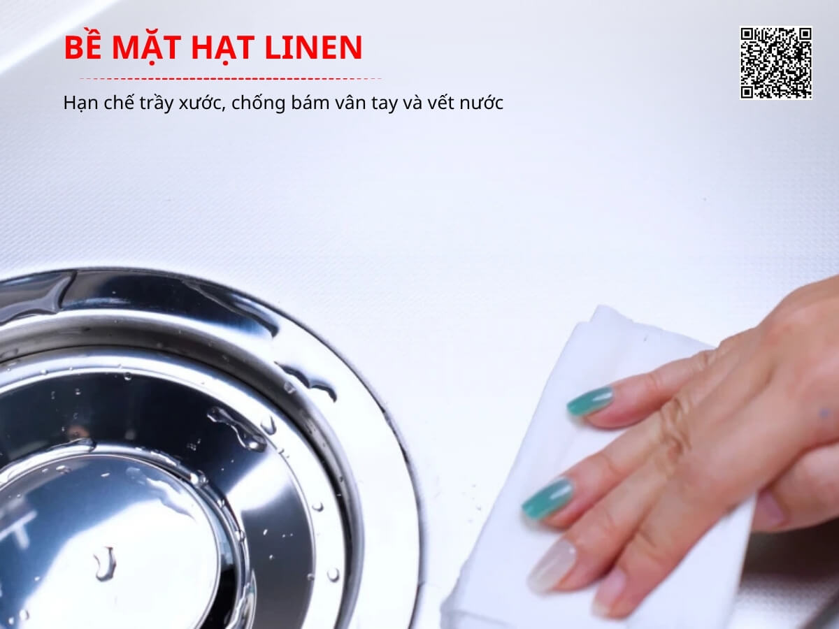 Điểm nổi bật của chậu inox Nobinox Lira NJ562D nằm ở bề mặt Hạt Linen dập nổi độc quyền, giúp chống trầy xước, chống bám vân tay và hạn chế mài mòn tối đa. Lớp hoàn thiện này không chỉ giúp chậu luôn sáng bóng, dễ vệ sinh mà còn tạo hiệu ứng ánh kim tinh tế, tăng thêm nét sang trọng cho căn bếp. Bề mặt này đặc biệt phù hợp với các hộ gia đình thường xuyên nấu nướng, đảm bảo chậu luôn giữ được độ mới và sạch sẽ sau nhiều năm sử dụng.