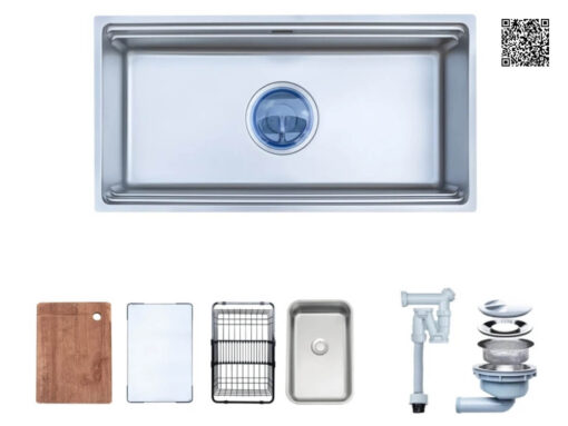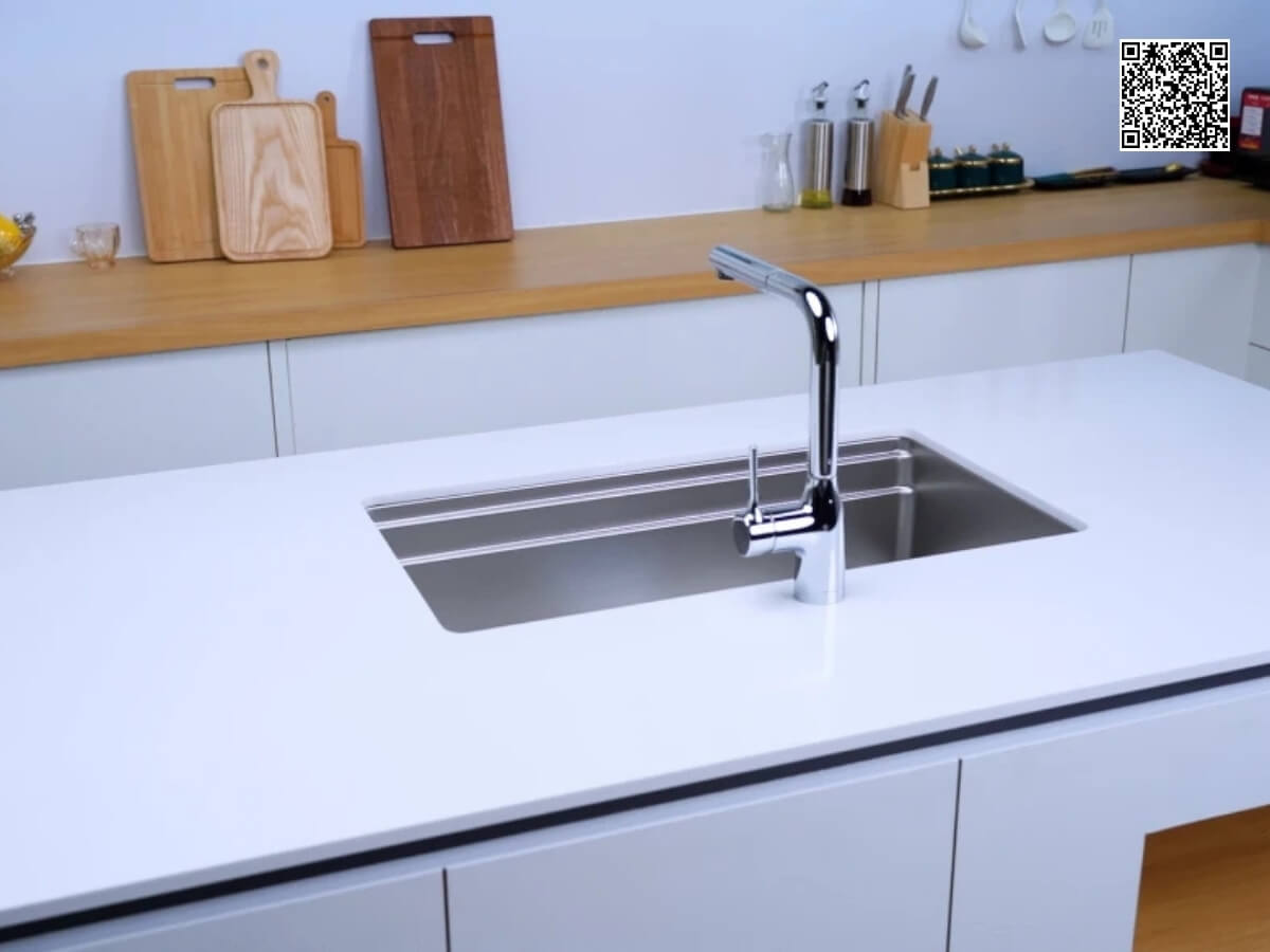 Điểm đặc biệt nằm ở gờ hạ bậc thông minh, cho phép tích hợp linh hoạt các phụ kiện như rổ lọc, khay úp hay thớt trượt, mang đến sự tiện nghi và tối ưu không gian làm việc. Thiết kế này không chỉ nâng cao tính thẩm mỹ mà còn giúp việc chuẩn bị, sơ chế thực phẩm và vệ sinh trở nên dễ dàng, nhanh gọn hơn.