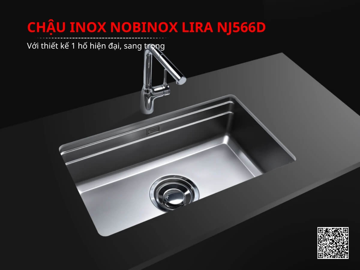 Chậu inox Nobinox Lira NJ566D với thiết kế 1 hố hiện đại, sang trọng