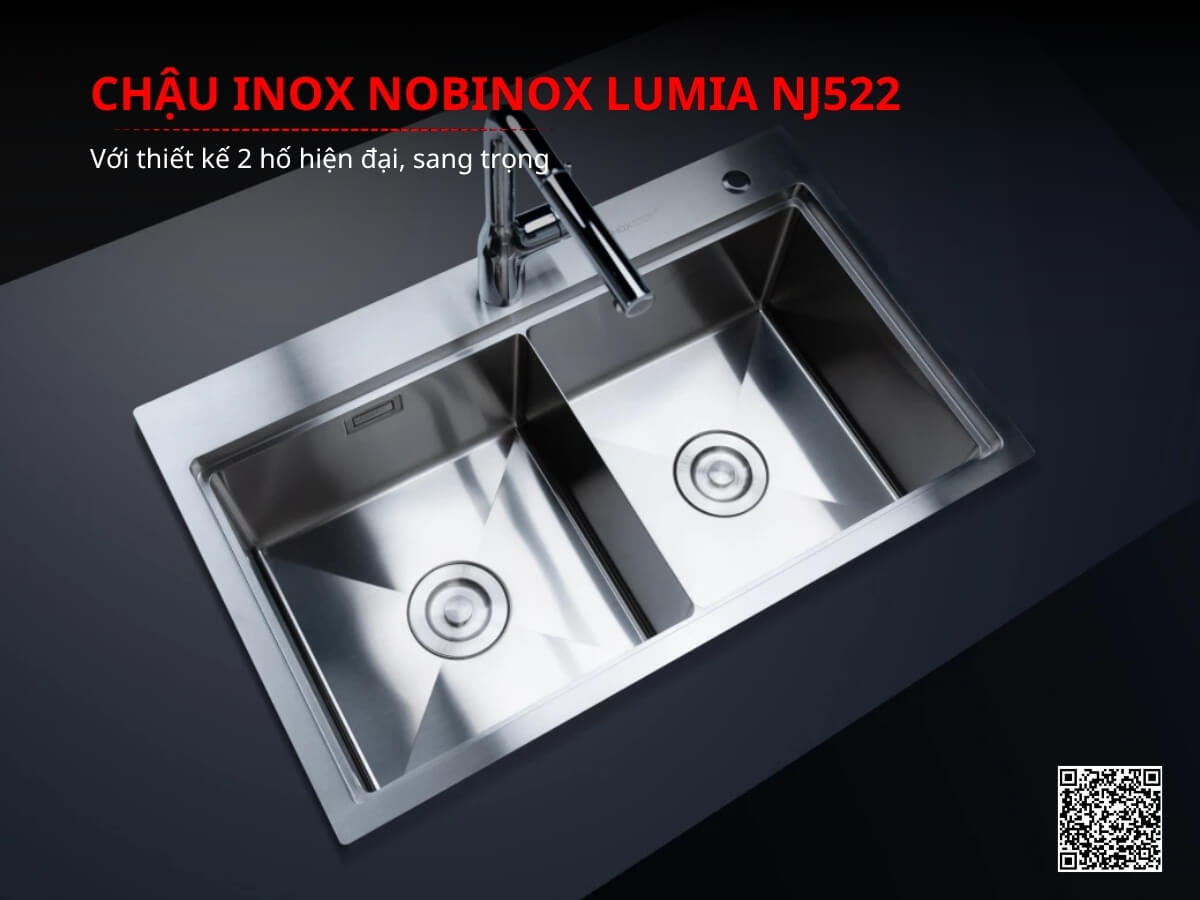 Chậu inox Nobinox Lumia NJ522 với thiết kế 2 hố hiện đại, sang trọng