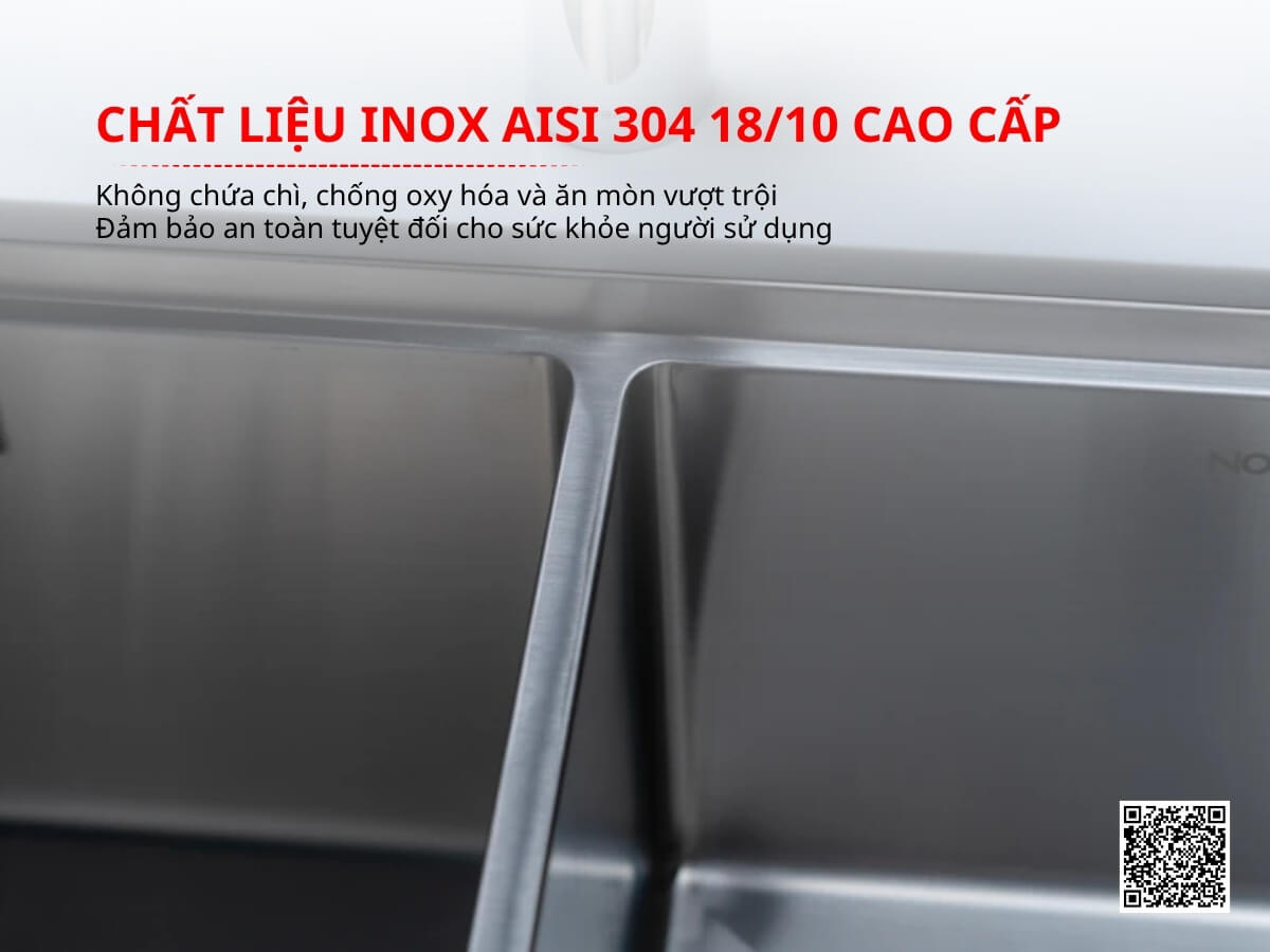 Toàn bộ chậu inox Nobinox Lumia NJ524 được sản xuất từ thép không gỉ Inox 304 chuẩn AISI 18/10, loại vật liệu nổi tiếng với khả năng chống oxy hóa, chống ăn mòn và không chứa chì, đảm bảo an toàn tuyệt đối cho sức khỏe người dùng.