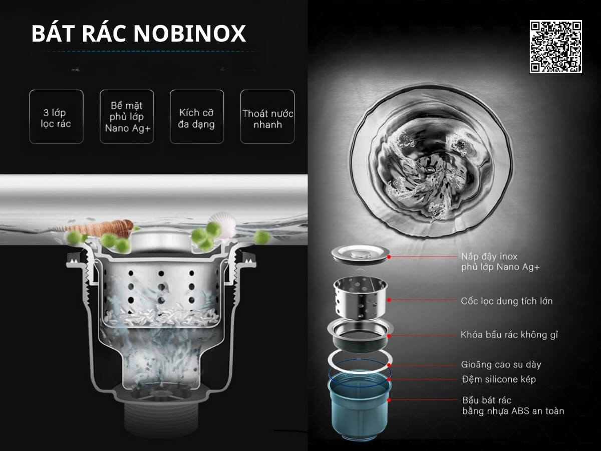 Một điểm cộng lớn của Nobinox Lumia NJ558B là hệ thống thoát nước cao cấp, giúp thoát nước nhanh và chống tắc nghẽn. Hố rác đường kính 140mm, được thiết kế 3 lớp lọc rác giúp ngăn cặn bẩn hiệu quả, phù hợp với thói quen sử dụng của người Việt.