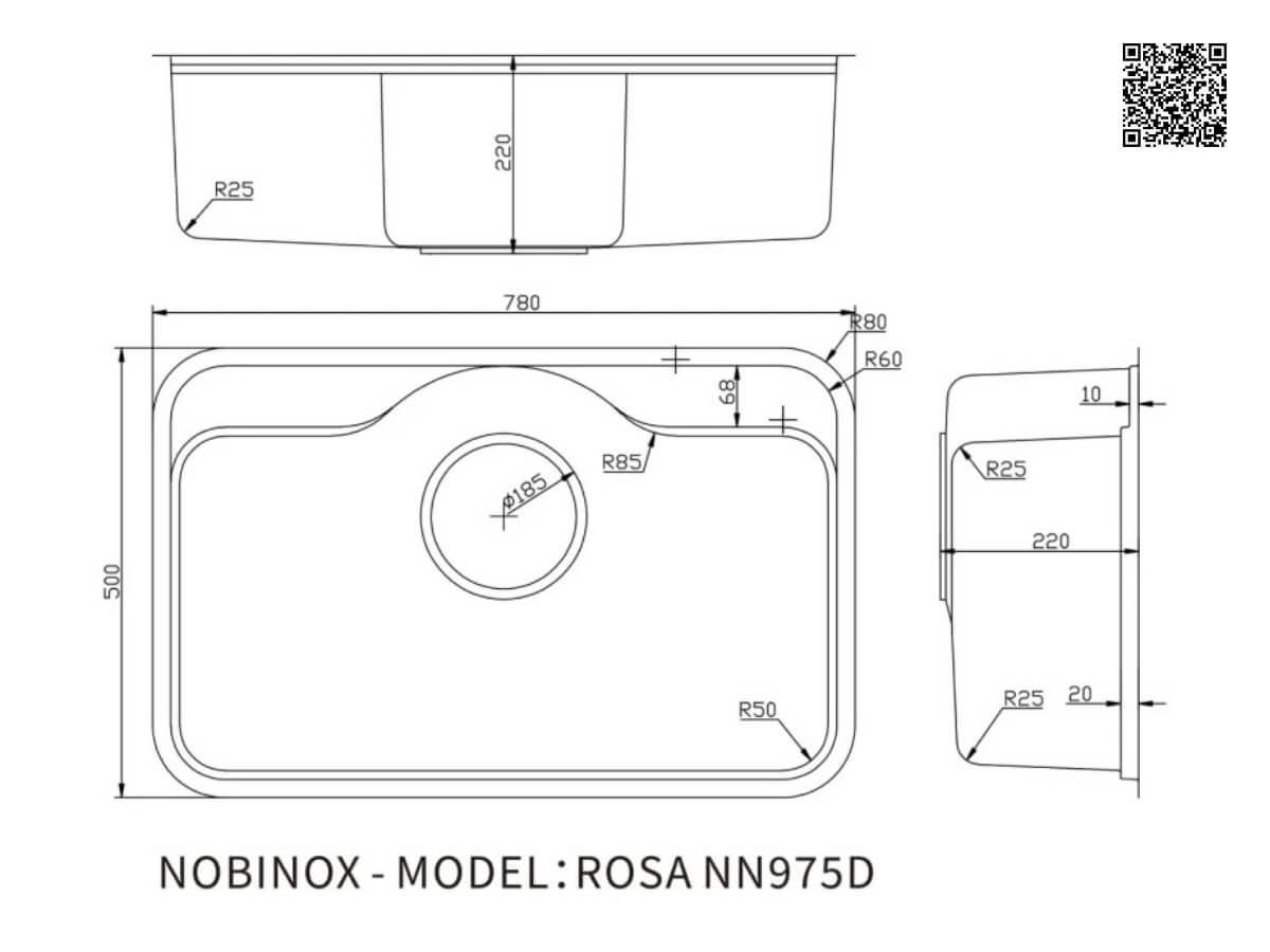 Kích thước và lắp đặt chậu inox Nobinox Rosa NN975D