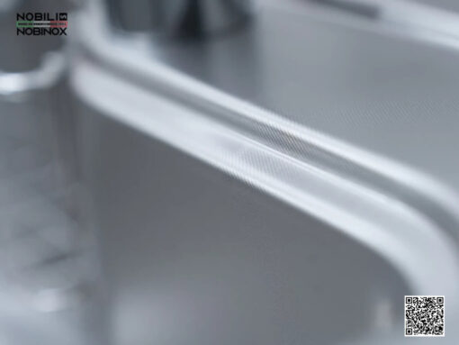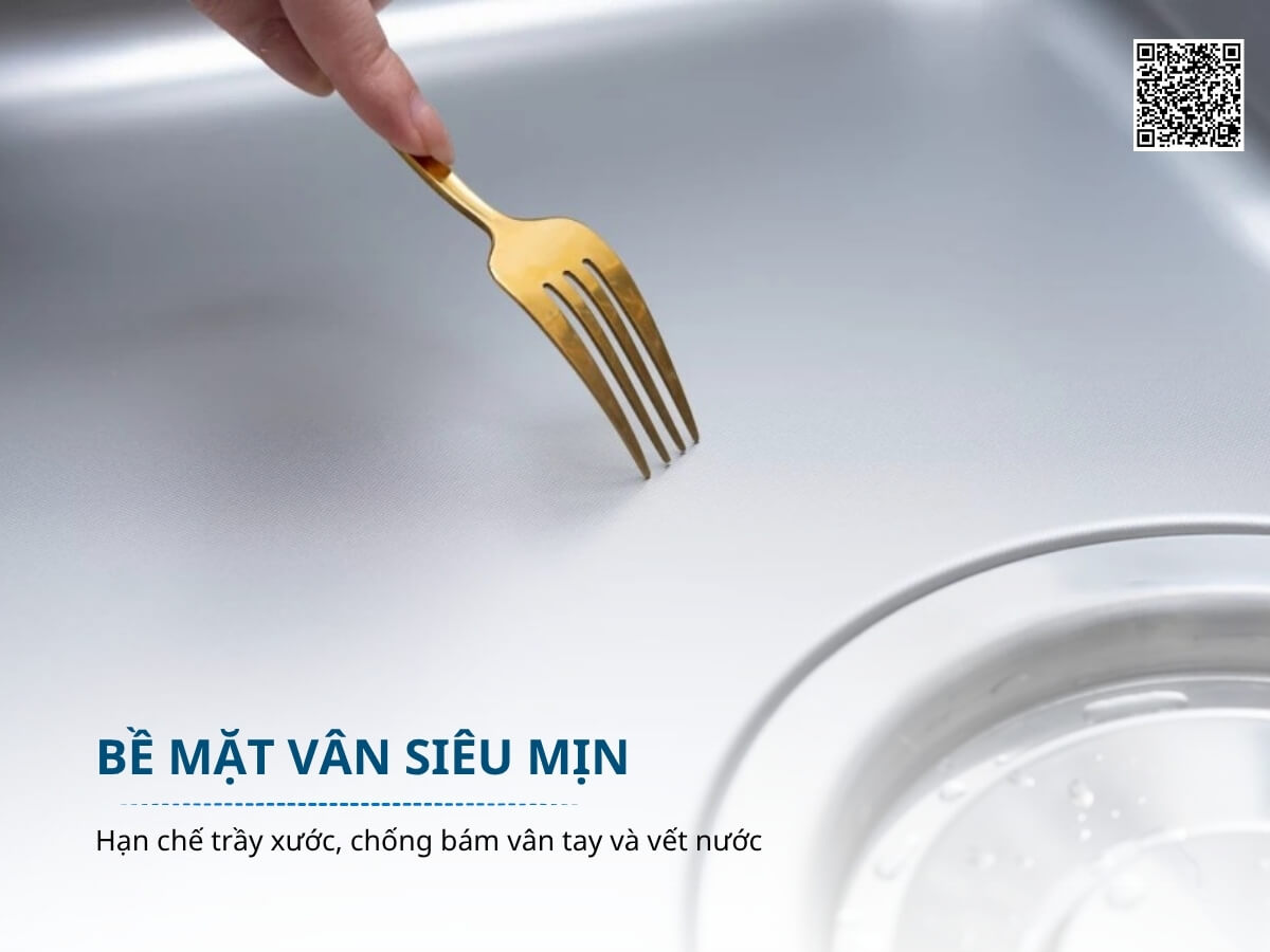 Điểm nhấn tạo nên sự khác biệt của chậu inox Nobinox Rosa NN975D chính là bề mặt vân siêu mịn nhằm tăng khả năng chống trầy xước và chống bám vân tay vượt trội. Công nghệ này giúp hạn chế mài mòn, giữ độ sáng mịn tự nhiên, đồng thời tạo hiệu ứng ánh sáng mềm mại, tinh tế, nâng tầm thẩm mỹ cho không gian bếp.